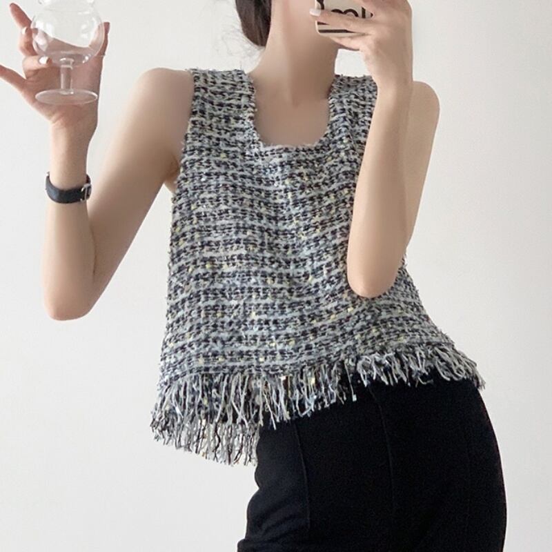 ツイードフリンジノースリーブトップス M1721